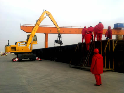 圖中所示:該抓管機(jī)正在進(jìn)行鋼管的卸火車作業(yè),卸火車裝汽車一次完成!鋼管由于太長,抓取時(shí)重心不太好掌握,我公司專門為其設(shè)計(jì)了專用抓具,便于抓取時(shí)掌握鋼管的重心,大大提高了鋼管的裝卸效率,受到了客戶的稱贊。